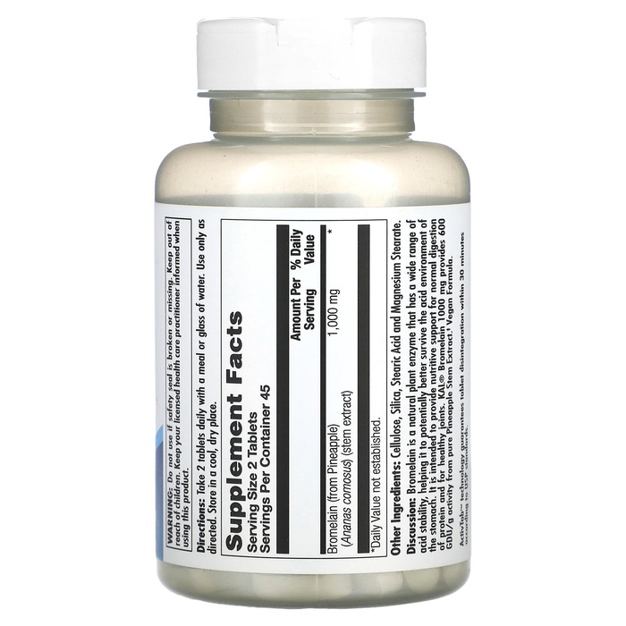 Описание. Бромелаин - это натуральный растительный фермент, который имеет широкий диапазон кислотной стабильности, помогая ему потенциально лучше выжить в кислой среде желудка. Он предназначен для обеспечения питательной поддержки нормального переваривания белка и здоровья суставов. Бромелаин KAL® 1000 мг обеспечивает активность 600 ГДУ / г из чистого экстракта стеблей ананаса.