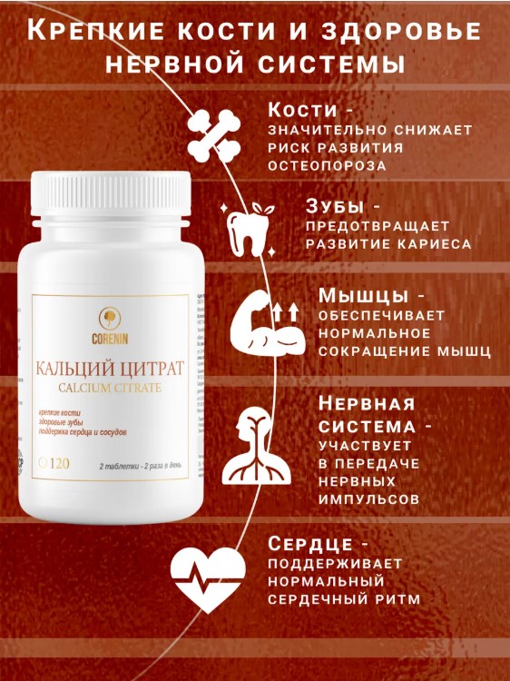 Кальций цитрат (600 мг) от бренда Corenin — это высококачественная добавка, предназначенная для поддержания здоровья костей и зубов. В каждой упаковке содержится 120 таблеток, что обеспечивает длительный курс приема.