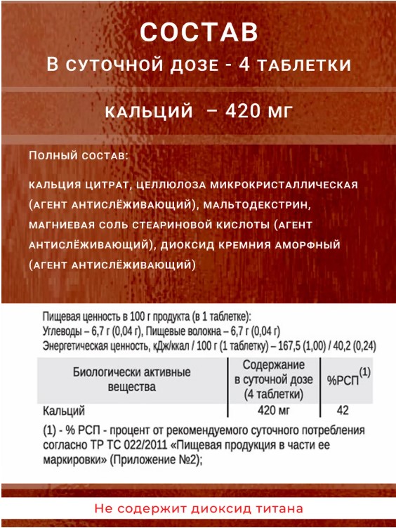 Таблетки кальция цитрата имеют нейтральный вкус и не содержат искусственных добавок, что делает их безопасными для регулярного использования. Рекомендуется принимать их в сочетании с витамином D для максимальной эффективности.