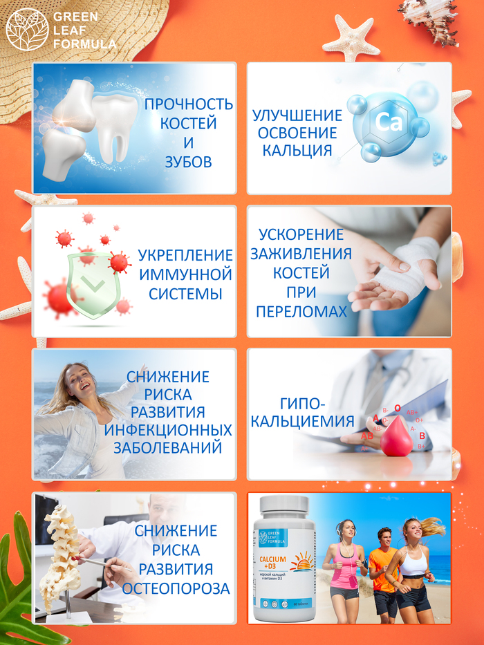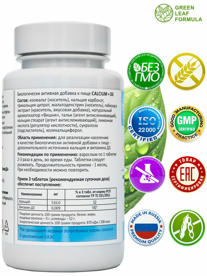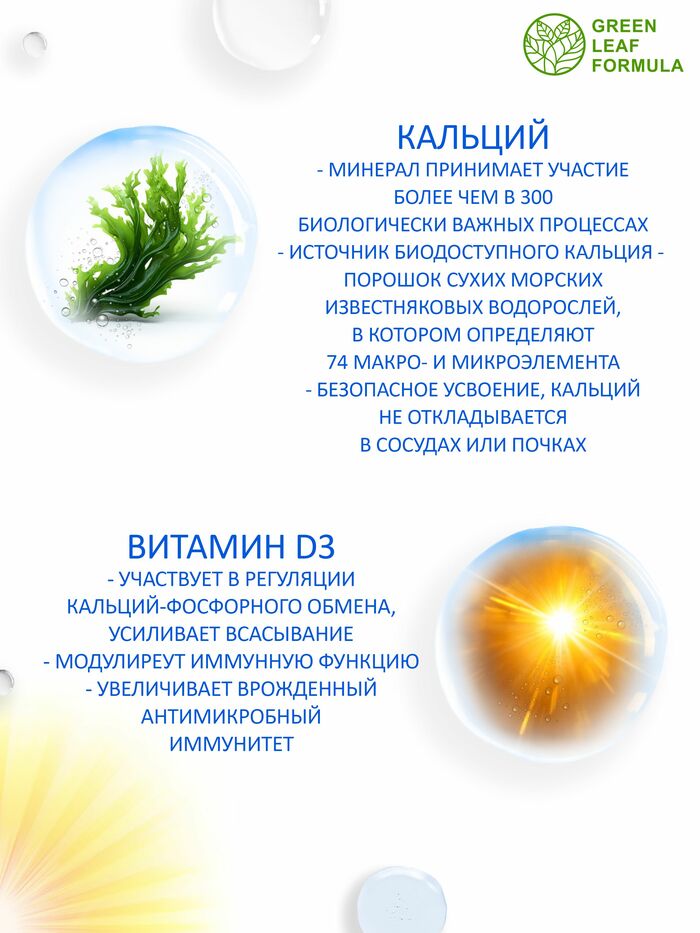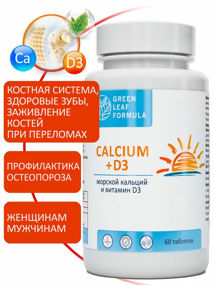 Кальций Д3 от бренда GREEN LEAF FORMULA — это эффективный комплекс для поддержания здоровья костей и зубов. В каждой упаковке содержится 60 таблеток, которые обеспечивают организм необходимым кальцием и витамином D3.
