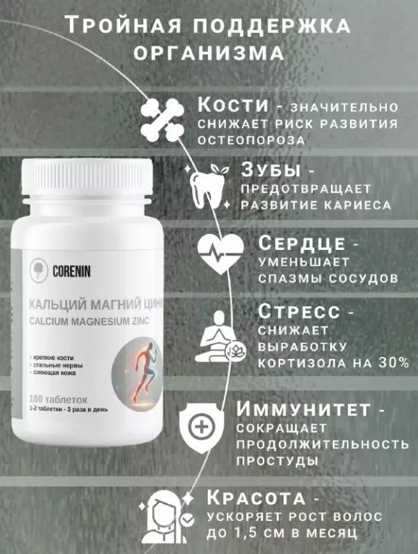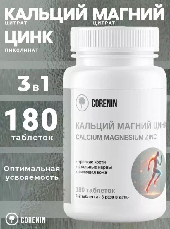 Кальций магний цинк (600 мг) от бренда Corenin — это высококачественный комплекс минералов, который поддерживает здоровье костей, зубов и нервной системы. В каждой упаковке содержится 180 таблеток, что обеспечивает длительный курс приема.