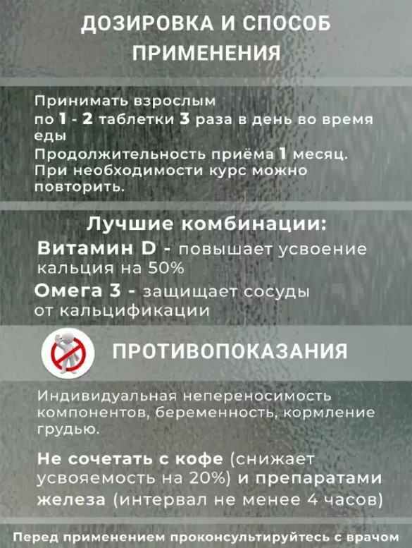 Таблетки легко проглатываются и подходят для ежедневного приема. Комплекс идеально подходит для людей, ведущих активный образ жизни, а также для тех, кто хочет поддерживать здоровье своих костей и зубов.
