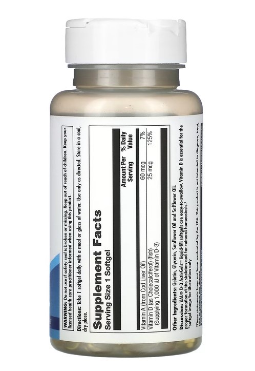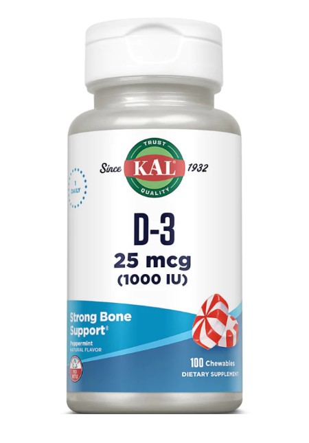 Kal Витамин D-3 1000 IU (25 мкг) — это добавка, содержащая витамин D-3 в дозировке 1000 МЕ в каждой таблетке с приятным мятным вкусом. Витамин D-3 играет ключевую роль в поддержании нормального уровня кальция в организме, что способствует укреплению костей и зубов. Он также поддерживает иммунную систему, способствует нормализации обмена веществ и помогает в борьбе с воспалительными процессами.