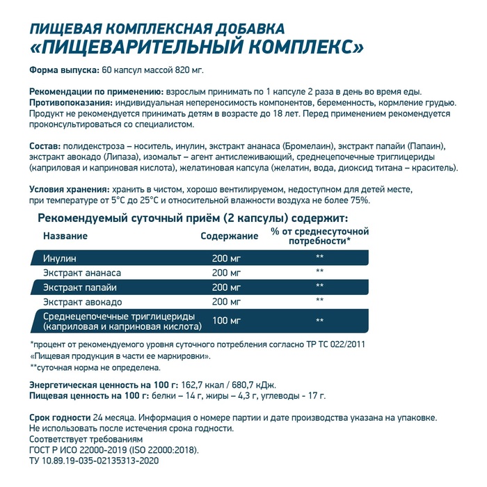 • Поддержка пищеварения: Комплекс содержит пребиотики, которые способствуют росту полезной микрофлоры в кишечнике.
