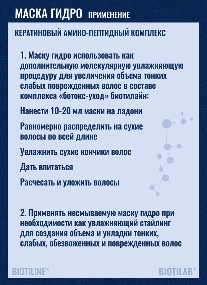 Несмываемая маска Hydro создана для ухода за тонкими обезвоженными волосами: после применения волосы становятся более гладкими, напитанными и защищенными. Подходит как для регулярного использования, так и для поддерживающего профессионального ухода дома.