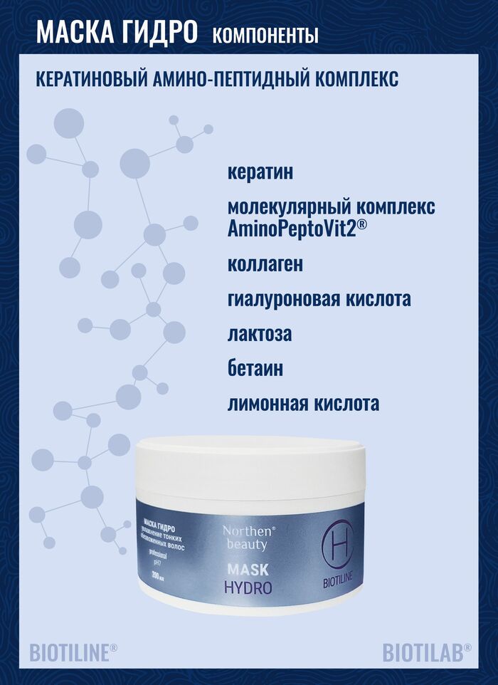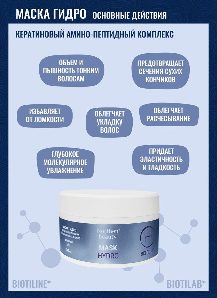 Кератиновая несмываемая маска Hydro от Northern Beauty для тонких обезвоженных волос — увлажняющее, защитное, витаминизированное и укрепляющее профессиональное средство в формате 200 мл.