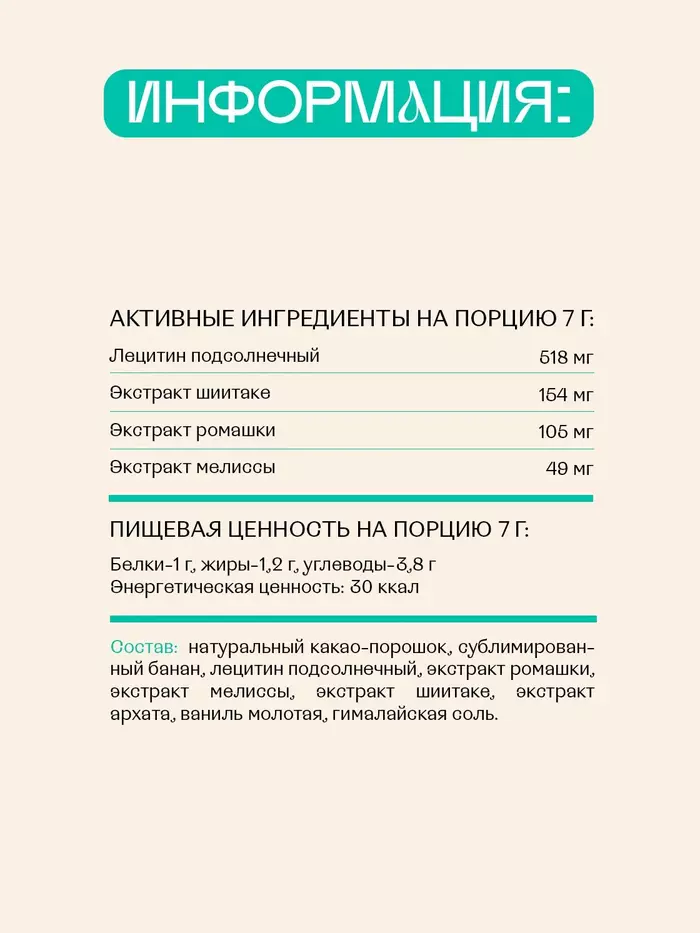 Let’s go bananas!Сочетание яркого бананового вкуса, насыщенного шоколада и натуральной ванили дарит ощущение тепла и радости. Плотная кремовая текстура позволяет не торопясь насладиться всеми оттенками сливочного вкуса какао.СУПЕРГЕРОИ:РОМАШКА успокаивает и помогает расслабиться. МЕЛИССА снимает напряжение. ШИИТАКЕ укрепляет иммунитет. ПОДСОЛНЕЧНЫЙ ЛЕЦИТИН улучшает память и концентрацию внимания.