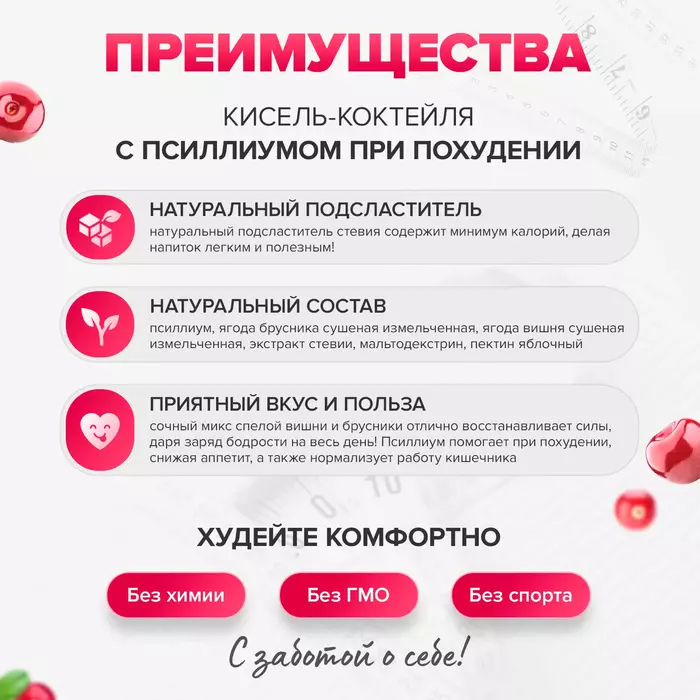 • Натуральные ингредиенты: Кисель содержит экстракты брусники и вишни, которые обогащают его витаминами и минералами.