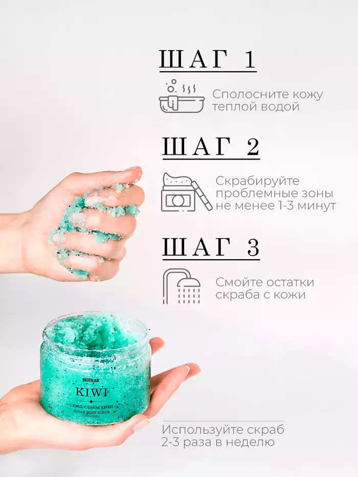 • Подходит для всех типов кожи: Скраб безопасен и эффективен для использования на всех типах кожи, включая чувствительную.