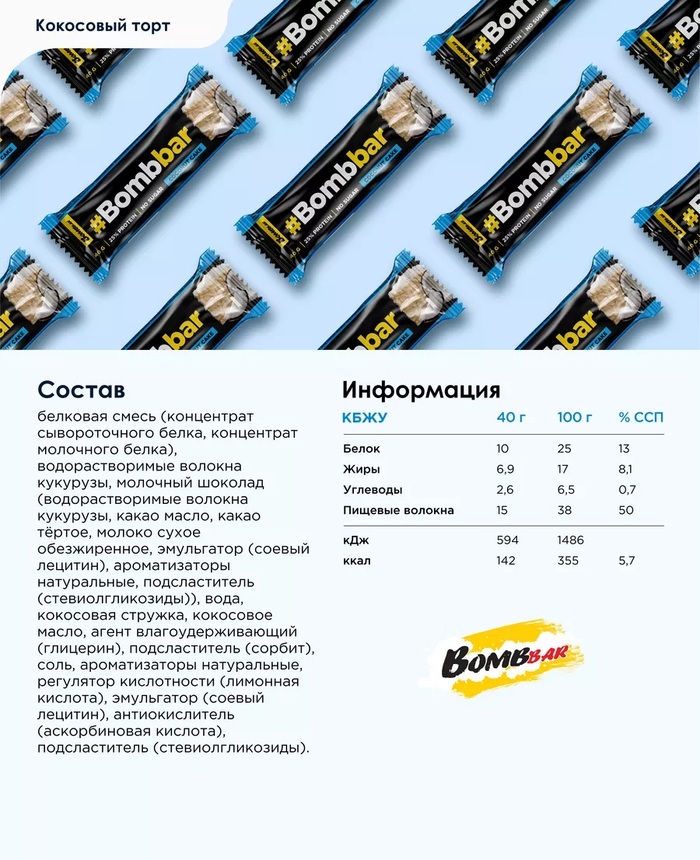 Bombbar Протеиновый батончик в шоколаде 25% белка Кокос, 40 г