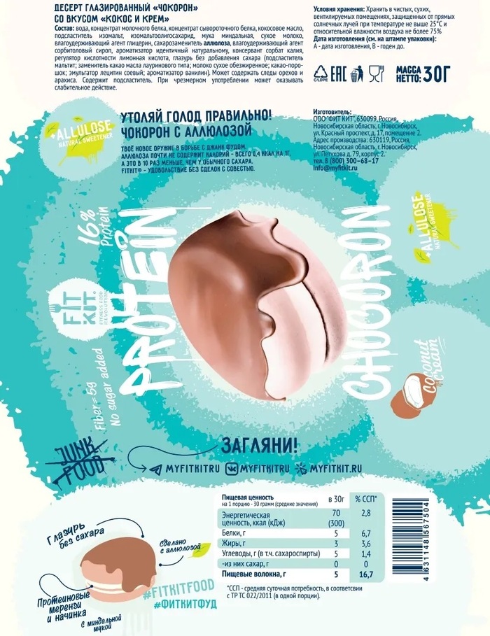 Fit Kit Протеиновый Макарон в шоколаде Chocoron Кокос-Крем, 30 г