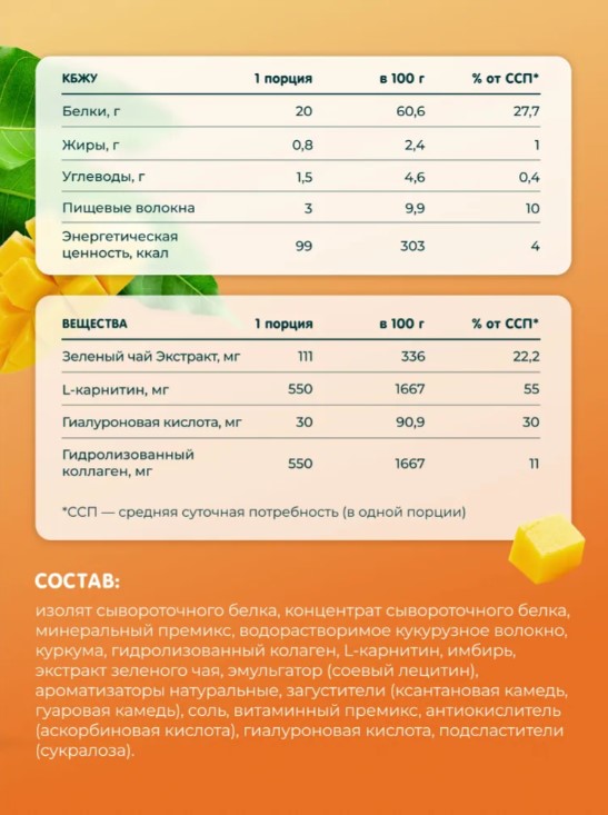 • Натуральные ингредиенты: В состав входят экстракты манго, имбиря и куркумы, которые придают коктейлю уникальный вкус и полезные свойства.