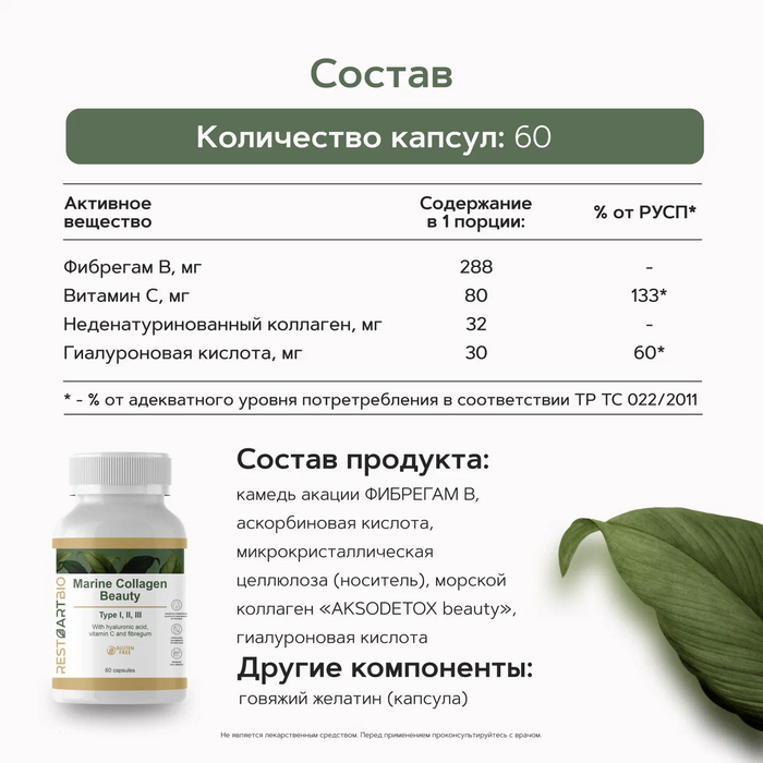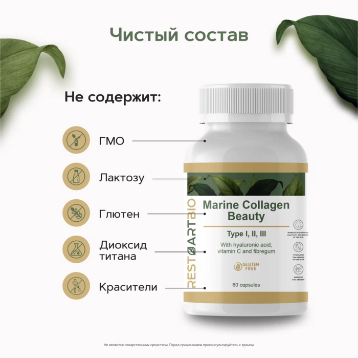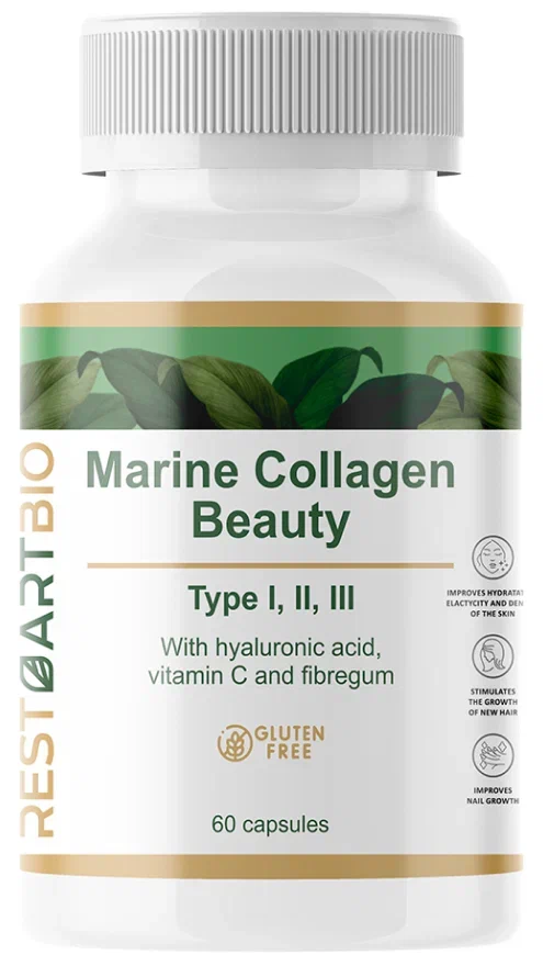 Коллаген морской Beauty I II III типа — это высококачественный продукт от бренда RestartBio, который поддерживает здоровье кожи, волос и ногтей. В каждой упаковке содержится 60 капсул, обеспечивающих ваш организм необходимым коллагеном для поддержания молодости и упругости.