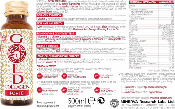 Коллаген питьевой Minerva Research Labs Gold Collagen Forte — это высококачественный продукт, который поддерживает здоровье кожи, волос и ногтей. В каждой упаковке содержится 10 флаконов, что обеспечивает удобство и простоту в использовании.