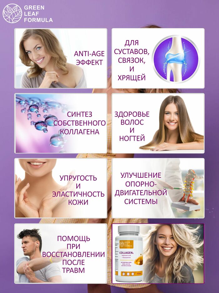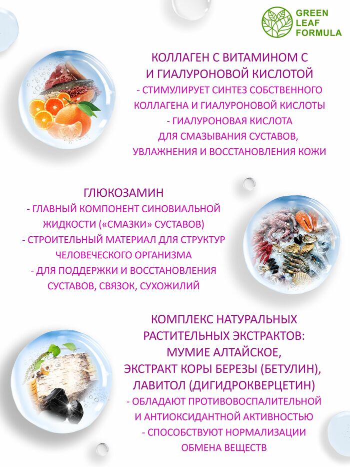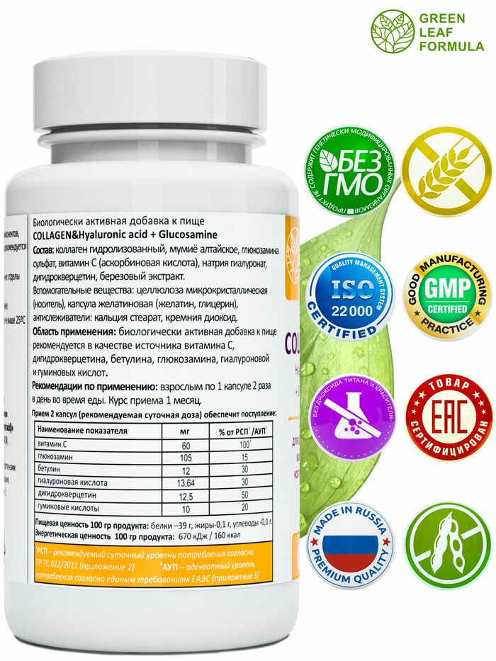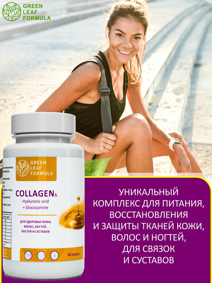 Коллаген с гиалуроновой кислотой и витамином С от бренда GREEN LEAF FORMULA — это высококачественная добавка, которая поддерживает здоровье кожи, суставов и волос. В каждой упаковке содержится 60 капсул, которые обеспечивают ваш организм необходимыми компонентами для поддержания молодости и красоты.