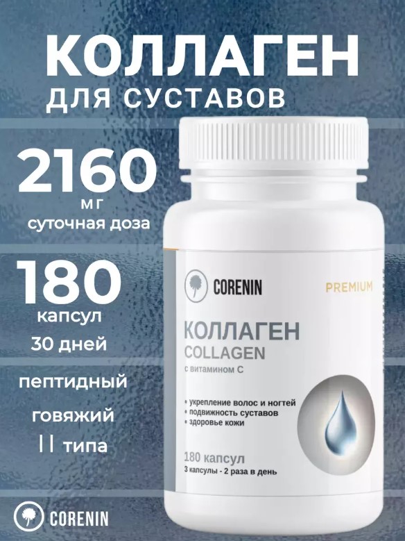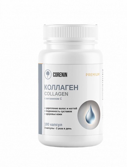 Коллаген с витамином С (500 мг) от бренда Corenin — это высококачественная добавка, которая поддерживает здоровье кожи, суставов и волос. В каждой упаковке содержится 180 капсул, что обеспечивает длительный курс приема.