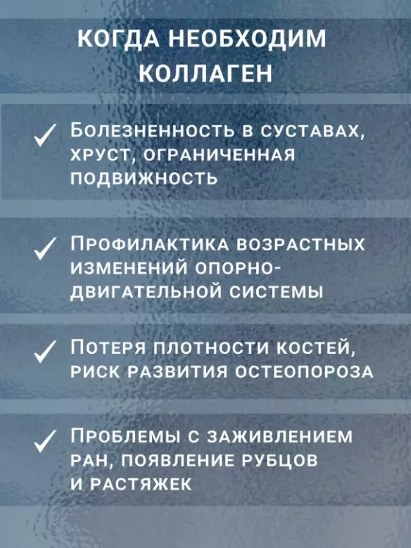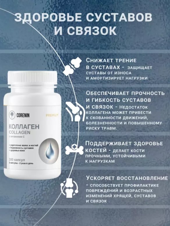 • Поддержка суставов: Коллаген помогает поддерживать здоровье суставов, улучшая их подвижность и снижая риск травм.