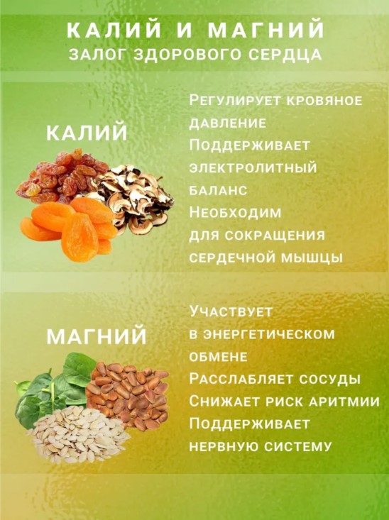 • Поддержка сердечно-сосудистой системы: Калий и магний способствуют нормализации сердечного ритма и поддерживают здоровье сосудов.