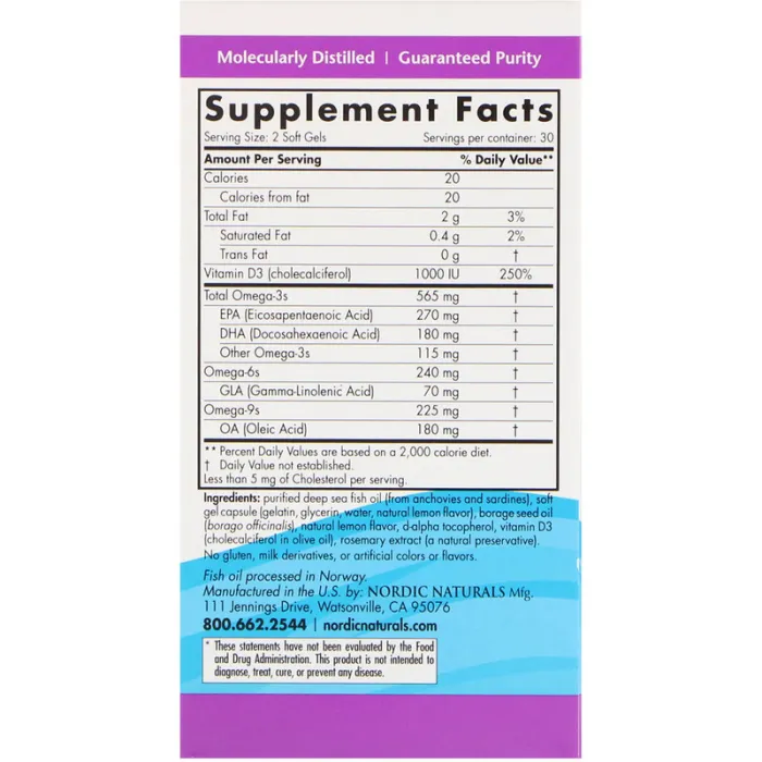 Nordic Naturals Комплекс Омега-3, 6, 9 с витамином D, 1000 мг, 60 капсул, вкус лимона, Nordic Naturals