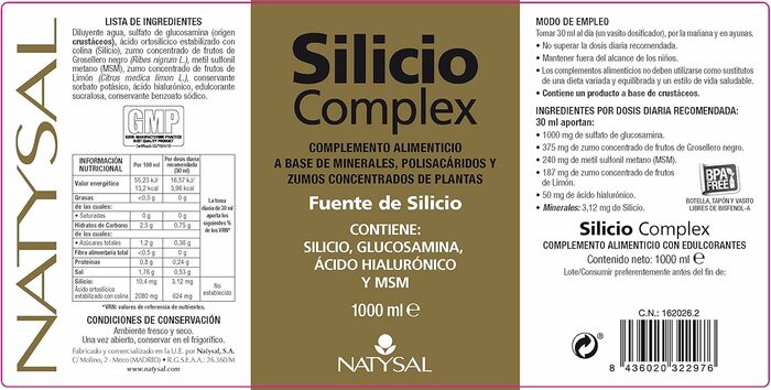 Комплекс с органическим кремнием Natysal Silicon Complex с глюкозамином и гиалуроновой кислотой — это высококачественный продукт, предназначенный для поддержания здоровья суставов и кожи. Объем упаковки составляет 1000 мл, что обеспечивает длительный курс применения.