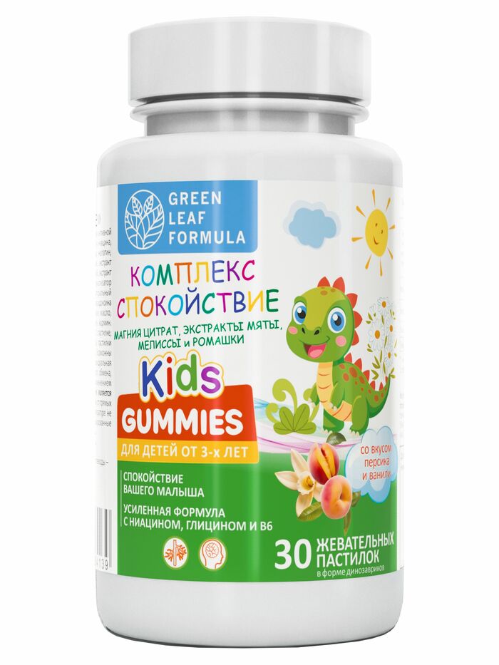 GREEN LEAF FORMULA Детский комплекс витаминов для спокойствия Персик Ваниль, 30 мармеладных табл
