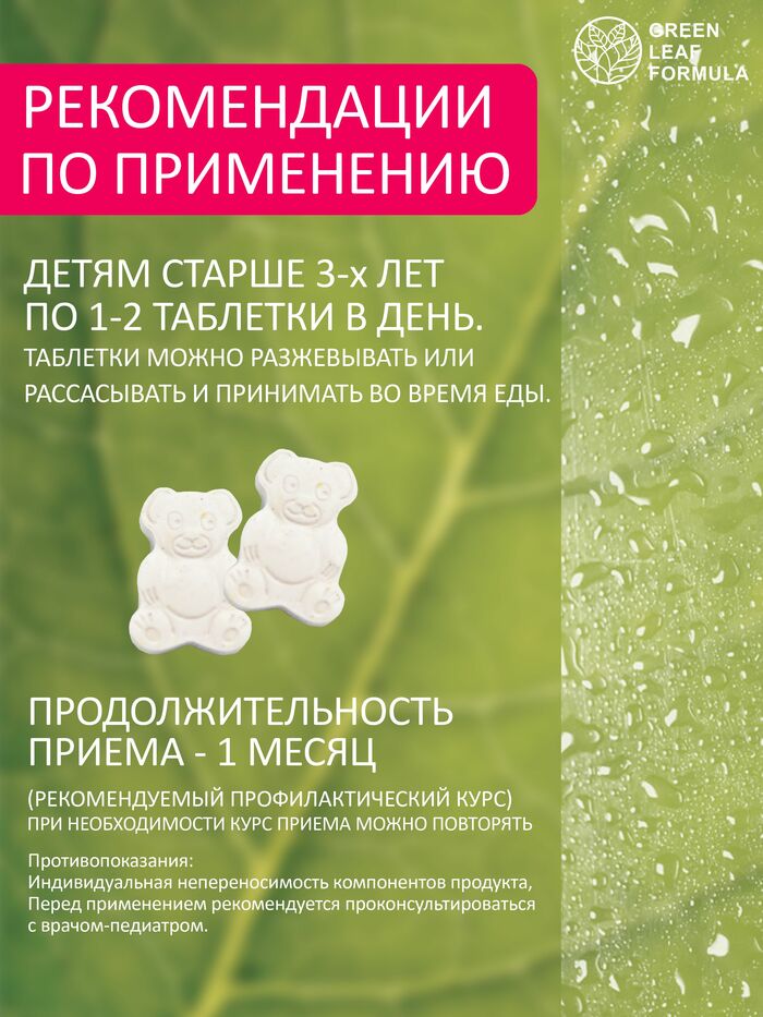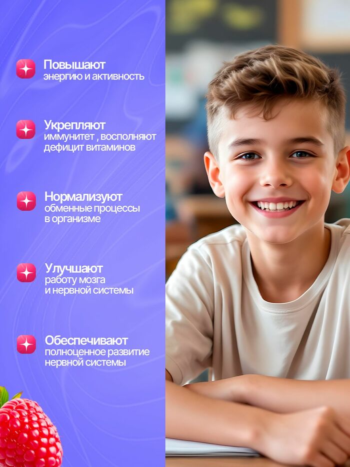 Жевательные таблетки имеют художественную форму и приятный малиновый вкус, что делает их особенно привлекательными для детей. Комплекс подходит для использования в периоды простудных заболеваний, при умственных и физических нагрузках, а также при несбалансированном питании.
