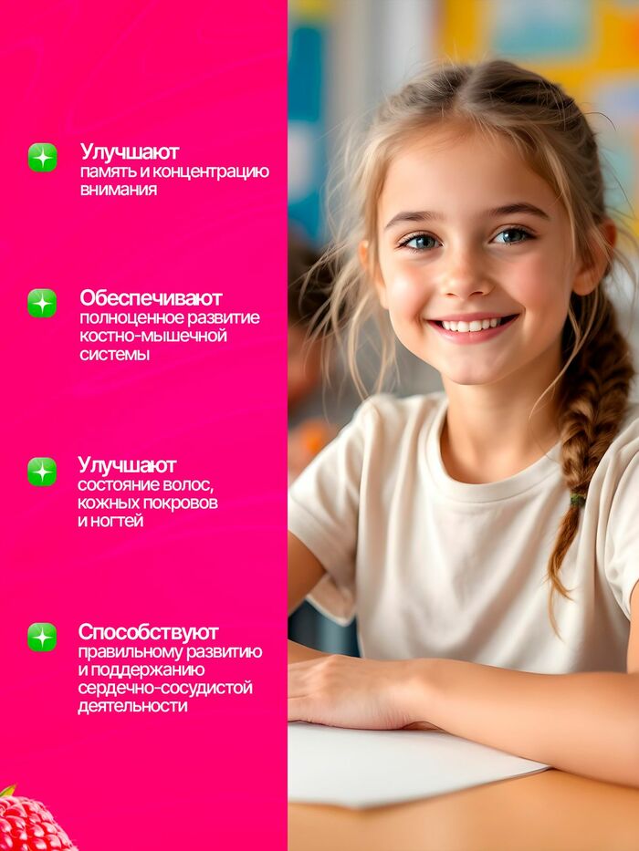 Комплекс витаминов для детей Малина — это идеальное решение для поддержания здоровья ваших детей. В каждой упаковке содержится 60 жевательных таблеток с приятным малиновым вкусом, которые обеспечат растущий организм необходимыми витаминами и минералами.