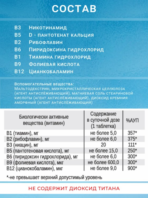 • Улучшение состояния кожи и волос: Витамины группы В поддерживают здоровье кожи, волос и ногтей, способствуя их укреплению и улучшению внешнего вида.
