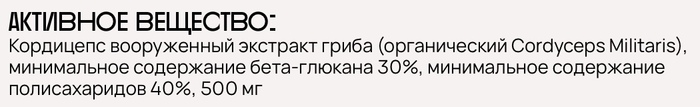 АКТИВНОЕ ВЕЩЕСТВО:Кордицепс вооруженный экстракт гриба (органический Cordyceps Militaris), минимальное содержание бета-глюкана 30%, минимальное содержание полисахаридов 40%, 500 мгСУПЕРСИЛЫ:✅ Природное тонизирующее средство✅ Увеличивает физическую выносливость организма✅ Поддерживает здоровое сексуальное функционирование✅ Снижает уровень холестерина в крови✅ Обладает противовоспалительным и обезболивающим действиемПОКАЗАНИЯ К ПРИМЕНЕНИЮ:✅ Физическое и умственное переутомление✅ Снижение иммунитета✅ Вирусные инфекции✅ Нарушение работы сердечно-сосудистой системы✅ Воспалительные процессы органов желудочно-кишечного тракта✅ Сексуальная дисфункция