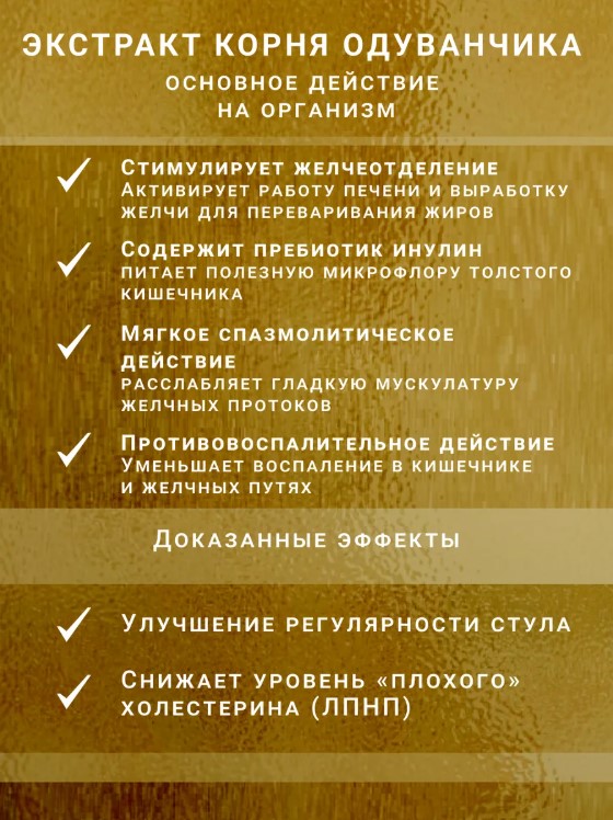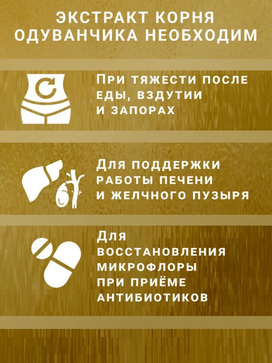 • Поддержка пищеварения: Экстракт корня одуванчика способствует улучшению работы пищеварительной системы и помогает при расстройствах.