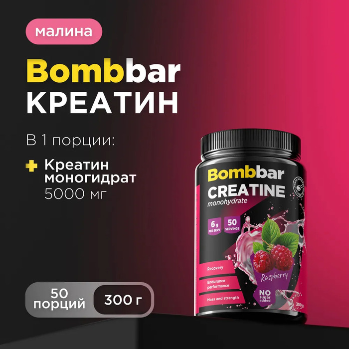 Bombbar Креатин моногидрат Малина, 300 г — это высококачественная добавка, разработанная для увеличения физической выносливости, силы и мышечной массы. Этот продукт идеально подходит для спортсменов и активных людей, стремящихся улучшить свои спортивные результаты и ускорить восстановление после тренировок.