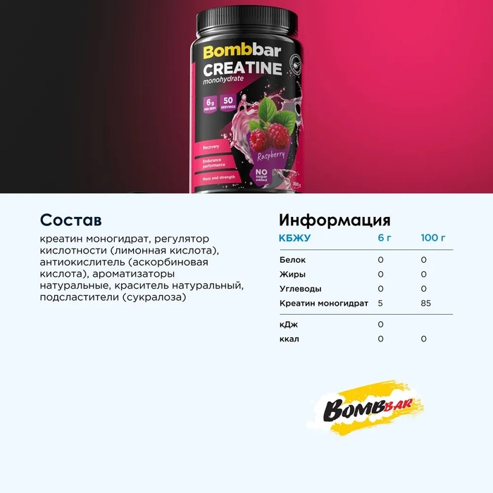 Bombbar Креатин моногидрат Малина отличается высокой степенью чистоты и качеством ингредиентов. Продукт не содержит сахара и искусственных добавок, что делает его безопасным и эффективным для ежедневного использования. Подходит как для профессиональных спортсменов, так и для любителей фитнеса.