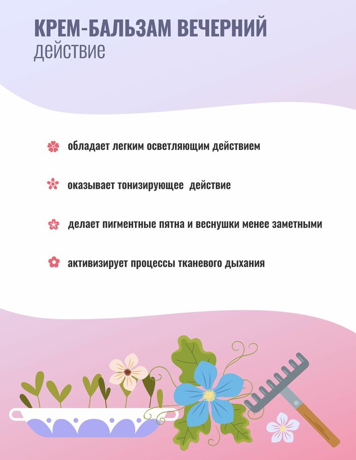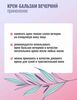 Нежный питательный крем для кожи любого типа. Легко впитывается, увлажняет, омолаживает кожу, разглаживает морщины, обладает отбеливающим эффектом, осветляет пигментные пятна и веснушки. Гипоаллергенен. Восстанавливает капиллярное кровообращение, активизирует процессы тканевого дыхания кожи. Эффективное лечебно-профилактическое средство. В лечебно-косметической практике используется для смягчения кожи при аллергических заболеваниях. Рекомендуется использовать крем-бальзам вечерний в качестве питательного крема после любых масок. Можно применять в качестве дневного крема для сухой и чувствительной кожи.Эффективно применяется в аппаратной косметологии.