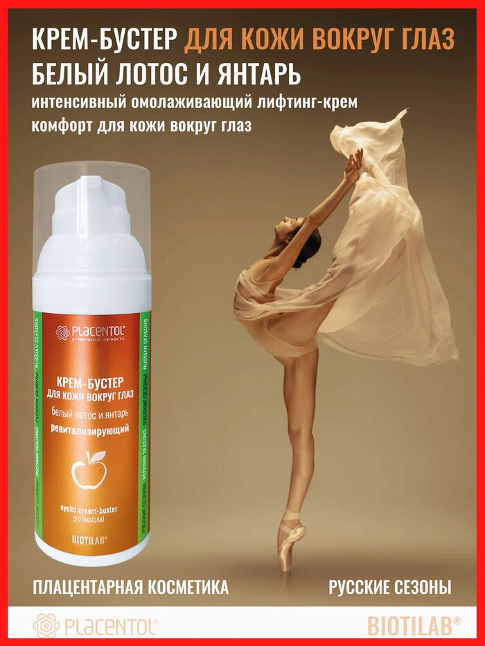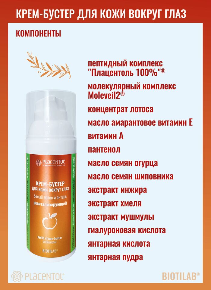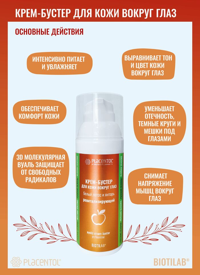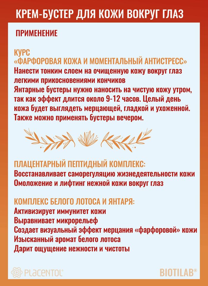 Крем-бустер предназначен для ухода за кожей вокруг глаз. Название бренда — «Плацентоль». Подходит для ежедневного применения, чтобы поддерживать увлажненность, тонус и визуальную свежесть взгляда.