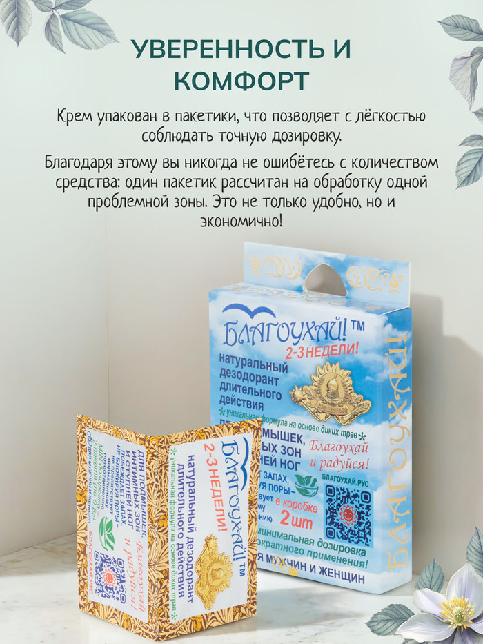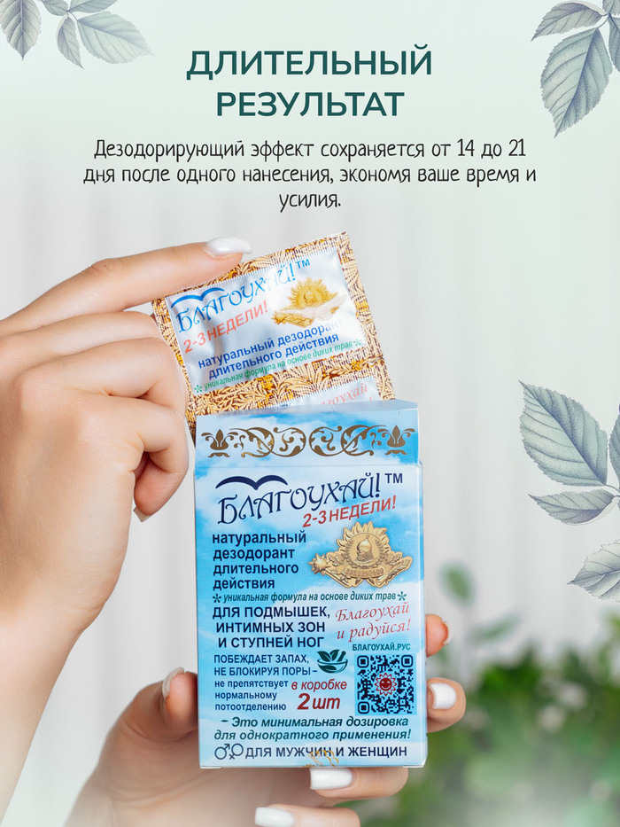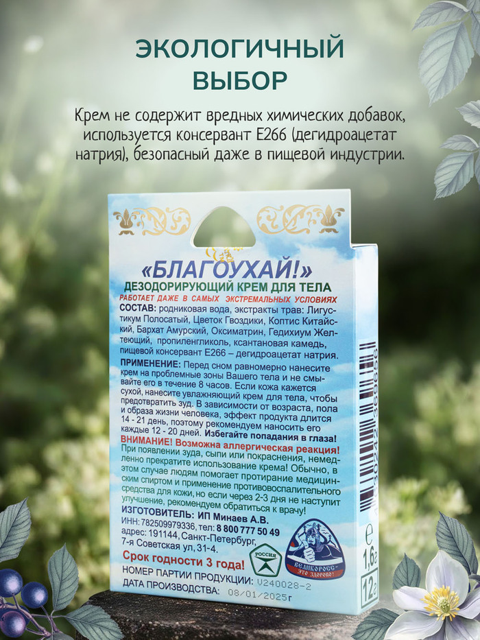 Крем-дезодорант длительного действия "Благоухай" от бренда Великоросс — это инновационное средство, созданное на основе древних рецептов русских лекарей и травников. Забудьте об агрессивных антиперспирантах, блокирующих поры, и обычных дезодорантах, которые лишь временно перебивают запах, пагубно влияя на здоровье вашей кожи и комфорт вашей жизни в целом!