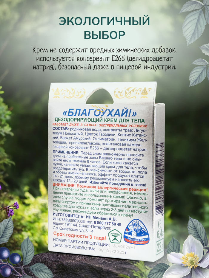 - Российское качество: "Благоухай" выпускается на ультрасовременном производстве, в соответствии с ГОСТом РФ, протестирован в лаборатории "ИЦ Вектор" и сертифицирован согласно действующему законодательству.