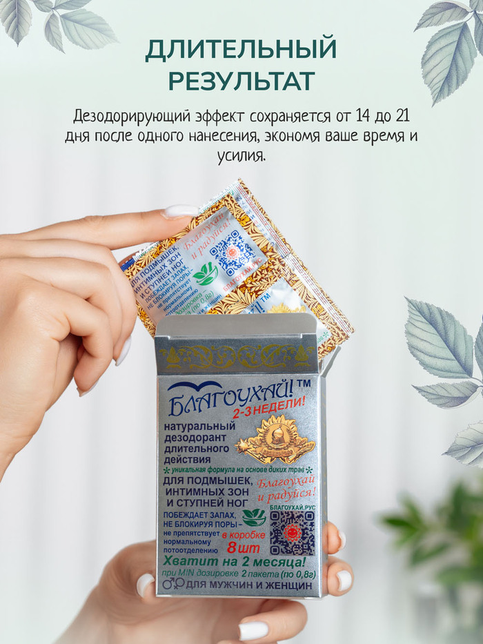 Крем-дезодорант длительного действия "Благоухай" от бренда Великоросс — это инновационное средство, созданное на основе древних рецептов русских травников. Забудьте об агрессивных антиперспирантах, блокирующих поры, и обычных дезодорантах, которые лишь временно перебивают запах, пагубно влияя на здоровье вашей кожи и комфорт вашей жизни в целом!