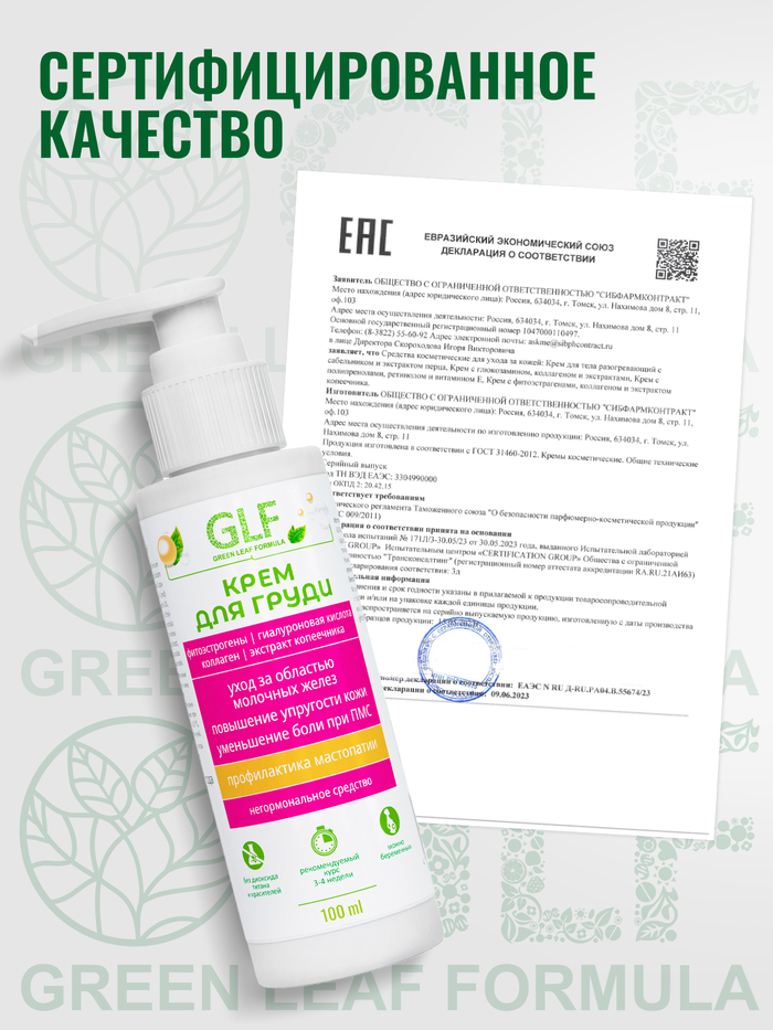 Крем для груди с фитоэстрогенами от бренда GREEN LEAF FORMULA — это уникальный продукт, разработанный для поддержания упругости и тонуса кожи груди. Объем упаковки составляет 100 мл, что обеспечивает длительное использование.