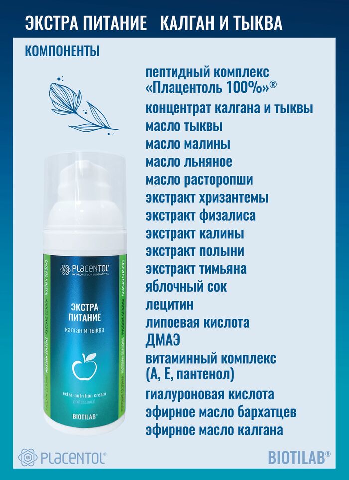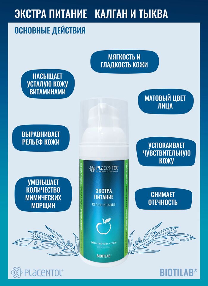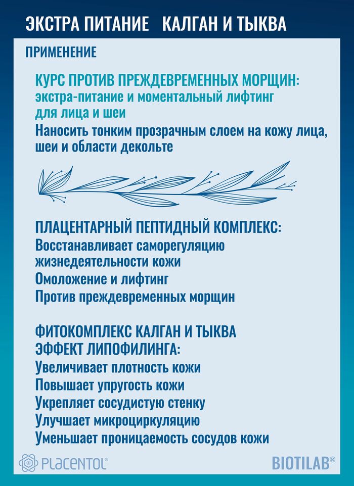 Крем с комплексом Калган и тыква подходит для ежедневного применения, чтобы сочетать питание, увлажнение и комплексный уход за возрастными проявлениями. Бренд Плацентоль предлагает этот крем для женщин, которым важны питание, тон, комфорт и сияние кожи.
