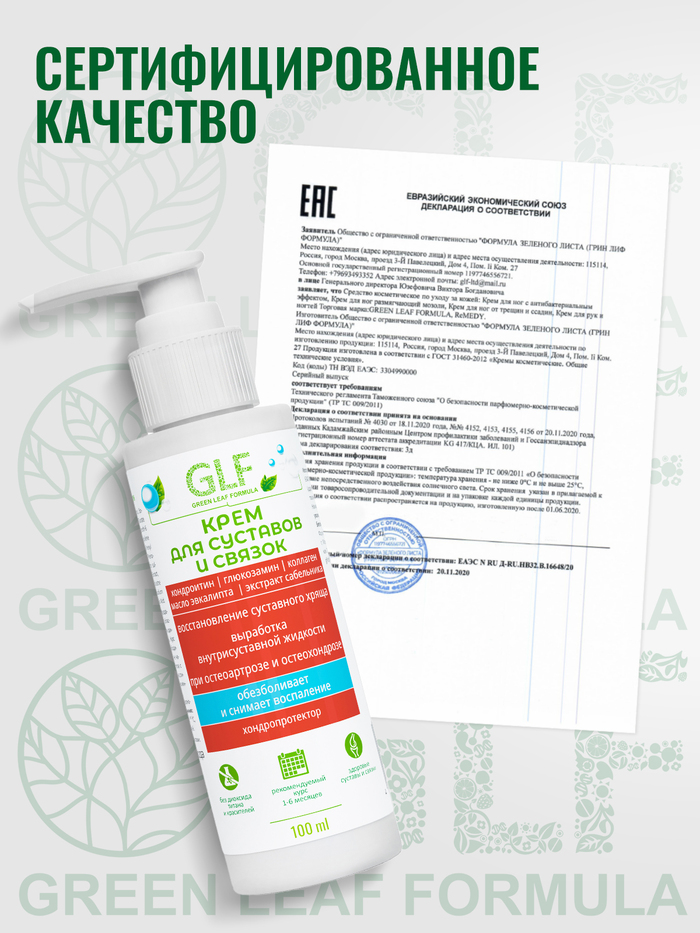 Крем для суставов и связок от бренда GREEN LEAF FORMULA — это эффективное средство, содержащее глюкозамин, хондроитин и коллаген. Объем упаковки составляет 100 мл, что делает его удобным для использования в домашних условиях.