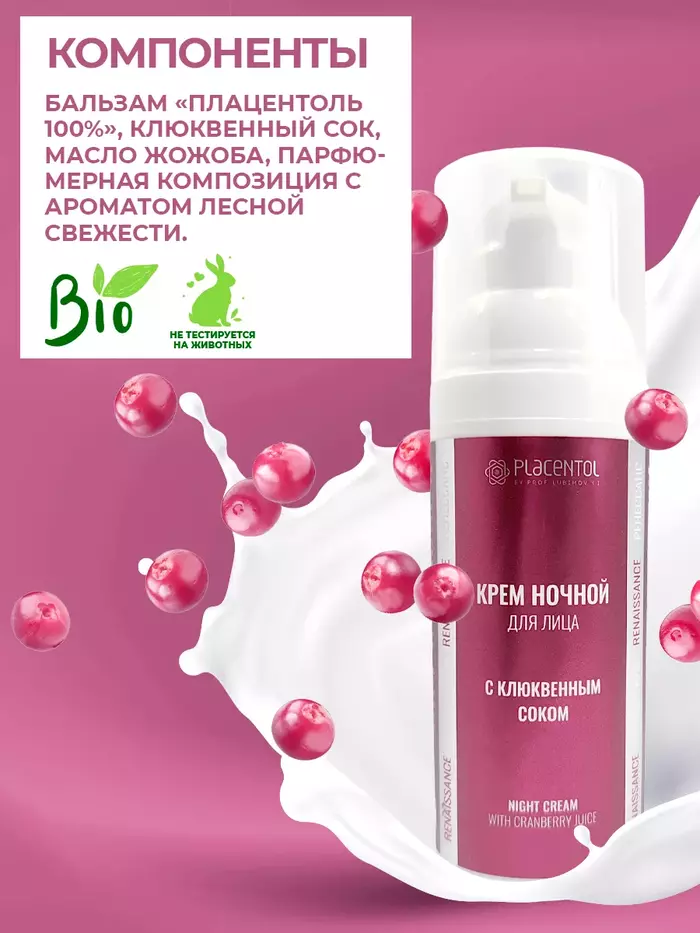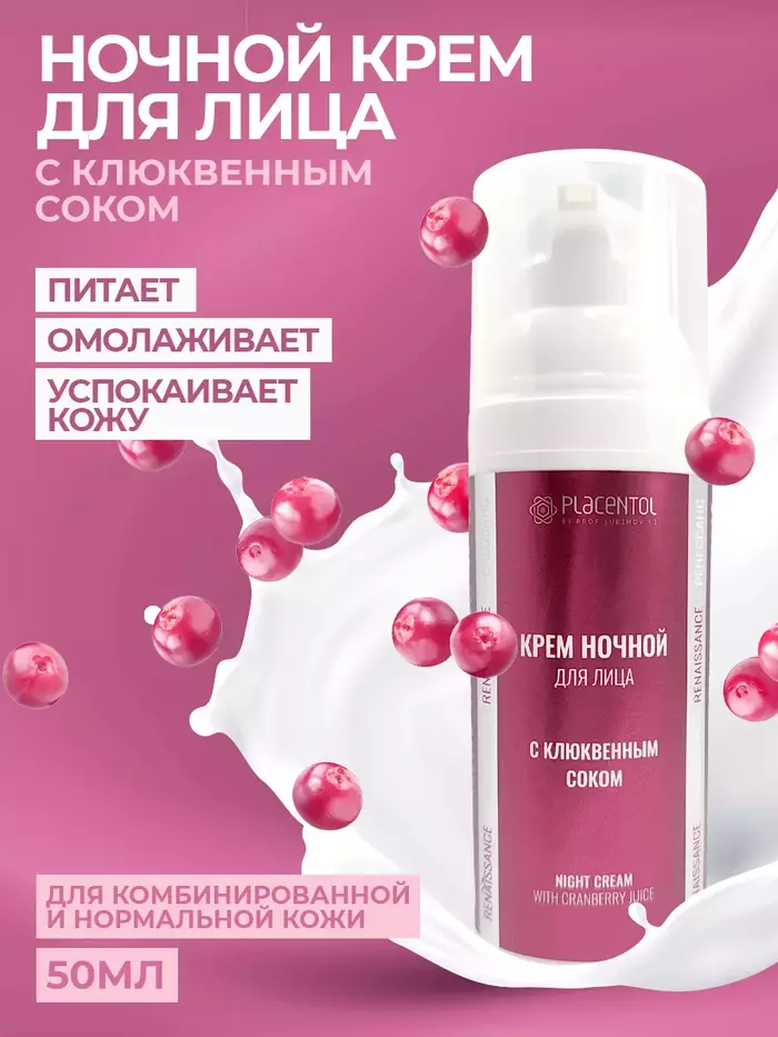 Крем ночной для лица Плацентоль с клюквенным соком (50 мл) — питательный, осветляющий и увлажняющий уход, который помогает коже восстановиться во время сна и выглядит более ровной и сияющей.