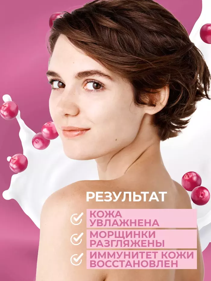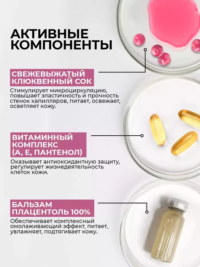 • Осветляющий эффект: клюквенный сок способствует улучшению тона и визуальной ровности кожи.