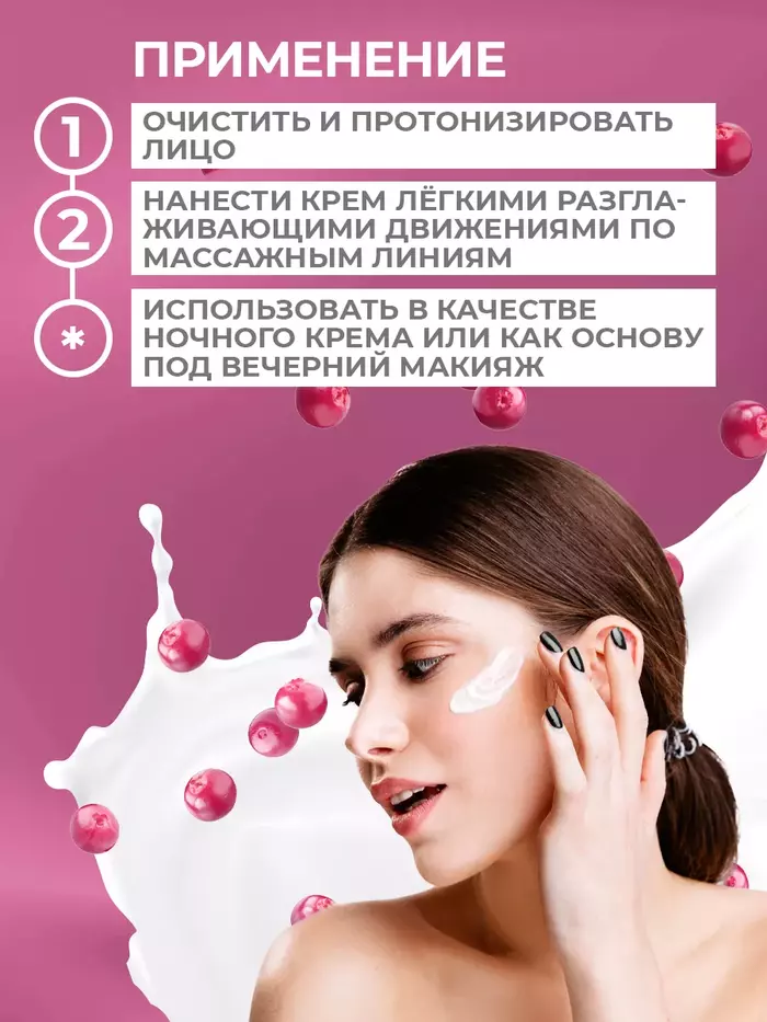 Крем с клюквенным соком рассчитан на ежедневное ночное применение. Он питает, увлажняет и помогает коже выглядеть более светлой и отдохнувшей, идеально подходит для ухода в период сезонной сухости и тусклости.