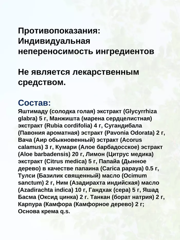 Алоэ (Алоэ Барбадосское) экстракт 20г, Ним (Азадирахта индийская) масло 10 г, Яштимадху (солодка голая) экстракт 5г, Лимон (цитрус медика) экстракт 5 г, Гандак (Сера) 5г, Манджистха (Марена сердцелистная) экстракт 4г, Вача (Аир обыкновенный) экстракт 3г, Сугандибала (павония ароматная) экстракт 2г, Тулси (базилик священный) масло 2г, Яшад Басма (Оксид цинка) 2г, Танкан (Борат неатрия) 2г, Камфора (Камфорное дерево) 2г, Папайя (Дынное дерево) в качестве папаина 0,5г, основа крема (молочная кислота, сорбитола дистеарат, цетомакрогол 1000, натрия гидроксид, полисорбат 80, хлорокрезол, бутилатгидроксианизол (БГА), ароматизатор "Боди фреш", вода очищенная) q.s.