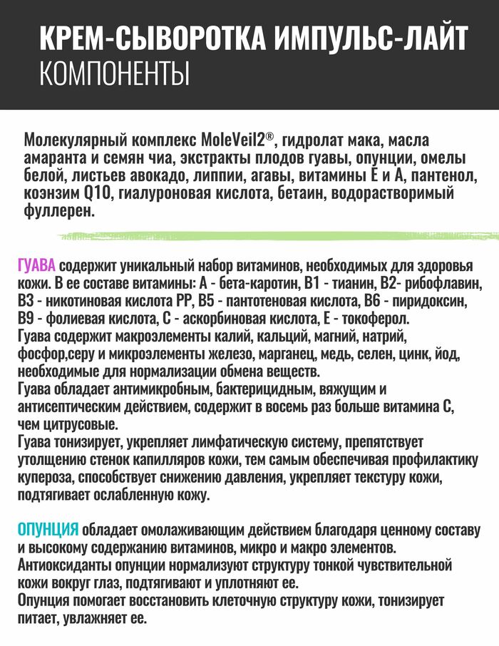 Пробудив кожу Драйвом, стоит закрепить полученный результат и придать ей импульс. Стимул к обновлению, поддержанию баланса и запуску процесса саморегуляции придаст крем-сыворотка Импульс-Лайт, предназначенная для ухода за комбинированной кожей и областью век.Легкое увлажняющее лифтинг-средство создано для комфортного ухода за кожей лица смешанного типа и вокруг глаз. Импульс-Лайт послужит идеальной базой под макияж.Насыщенный аромат экзотических растений со сладко-дурманящими нотами мака освежает и одновременно дарит уют. Импульс – как две стороны медали – с утра он настроит на рабочий лад, активизирует, пробудит своей мягкой свежестью, а в процессе вечернего ухода подарит ощущение комфорта и защищенности, отодвигая на задний план все проблемы уходящего дня.Молекулярный комплекс, обогащенный маслами и экстрактами растений жаркой Мексики, обеспечит комплексный уход, включающий омоложение, защиту от внешних и внутренних воздействий и борьбу с проблемами, а также восстановит функциональное состояние чувствительной кожи.Гидролат мака – мощный антиоксидант, способный уменьшить агрессивное влияние на кожу свободных радикалов, отвечающих за процессы старения. Маковая вода смягчает, увлажняет и успокаивает кожу, снимает раздражение. Гидролат мака также обладает выраженным антивозрастным действием и снижает клеточный стресс и повреждения, вызываемые негативным воздействием окружающей среды, УФ-излучением, курением.Масло амаранта – залог молодости кожи! Драгоценный эликсир, способный затормозить процесс старения и разгладить возрастные и мимические морщинки. Амарантовое масло ускоряет синтез коллагена и стимулирует рост новых клеток, тем самым возрождает увядающую кожу, повышая ее упругость и придавая ей здоровый оттенок.Экстракт экзотической гуавы обладает поистине невероятными свойствами – с одной стороны, он выступает эксфолиантом, мягко очищая кожу и обеспечивая антибактериальный эффект, с другой – оказывает антиоксидантное воздействие, питает кожу и эффективно борется не только с воспалениями и следами от них, но и с пигментными пятнами, выравнивая и улучшая цвет лица.Экстракт опунции не менее интересен в косметологическом плане – помимо увлажнения и питания, он восстанавливает водный баланс кожи и улучшает ее кровоснабжение, укрепляет сосуды. Галактуроновая кислота в составе экстракта является многофункциональным соединением, которое активно увлажняет кожу, оказывает антибактериальное действие, являясь неоспоримым помощником в борьбе против воспалений.Молекулярная вуаль обеспечивает мгновенный лифтинг кожи, улучшает ее текстуру, уменьшает отеки и темные круги под глазами.Инновационный антиоксидант фуллерен С60 нейтрализует свободные радикалы.Удобный флакончик с вакуумным дозатором обеспечит гигиеничность и сохранность продукта на протяжении всего срока использования.