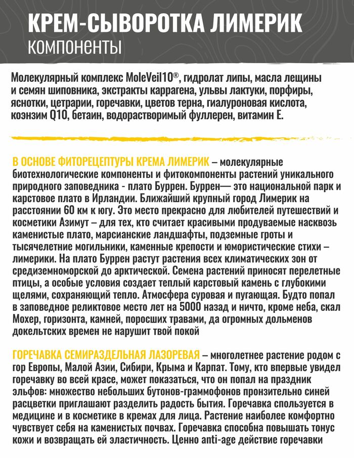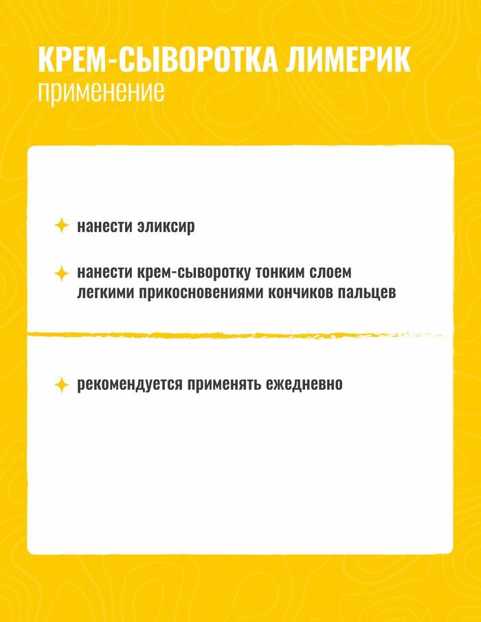 Не только сухой и тонкой коже постоянно не хватает комфорта, жирная пористая кожа также часто чувствительна, крайне восприимчива к воздействиям извне и раздражена без видимых причин. Такой коже необходим постоянный легкий уход, который без утяжеления успокоит ее.Именно для этих целей и предназначена восстанавливающая крем-сыворотка Лимерик, чья нежная консистенция и специальный успокаивающий состав просто созданы для комфортного ухода за кожей лица.Список активных компонентов Лимерика включает в себя одни из самых действенных ингредиентов, способных вернуть раздраженной коже состояние покоя:Гидролат липы – спасение для чувствительной, увядающей кожи. Систематическое применение средств, содержащих его, повышает защитные функции кожи, успокаивает и снимает раздражение. Помимо этого, липовая вода дарит легкий омолаживающий эффект, стимулируя образование коллагена, тем самым замедляя старение кожи. Масло лесного ореха при регулярном использовании способно нормализовать водный баланс кожи, а так же избавить от мелких морщин и начальных проявлений купероза. Комплекс водорослей холодных морей способствует выводу токсинов и удержанию влаги в коже. Витамины в их составе избавляют кожу от шелушения и способствуют ее обновлению. Водоросли визуально подтягивают кожу, разглаживают и придают эластичность, а также защищают ее от агрессивного воздействия внешней среды.Молекулярный комплекс выравнивает тон и рельеф кожи. Инновационный антиоксидант фуллерен С60 нейтрализует свободные радикалы, предохраняет кожу от повреждений.