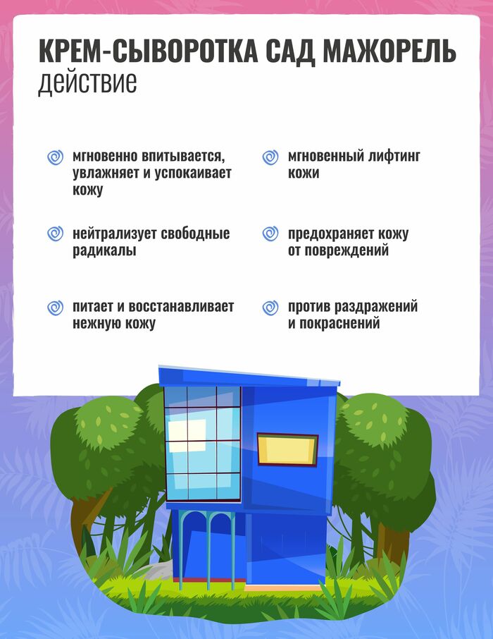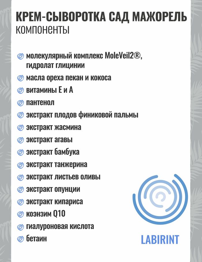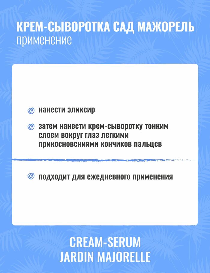 Come to Marrakesh… Come to Majorelle… Чтобы прикоснуться к тропическому саду, не нужно никуда лететь – достаточно заполучить в свою коллекцию крем-сыворотку Увлажнение и лифтинг «Сад Мажорель». Экзотичное название этого представителя молекулярной косметики обусловлено наличием в его составе масел и экстрактов тропических растений. Сыворотка Мажорель предназначена для интенсивного лифтинг-ухода за чувствительной, возрастной, атоничной кожей лица и областью век. Как действуют активные ингредиенты средства?Молекулярная вуаль обеспечивает мгновенный лифтинг кожи.Инновационный антиоксидант фуллерен С60 нейтрализует свободные радикалы, предохраняет кожу от повреждения и эффективно борется с признаками старения.Комплекс производных тропических растений питает и восстанавливает нежную кожу, обеспечивая ее комфорт. Масло ореха пекан снимает раздражение и, наравне с маслом кокоса, питает сухую обезвоженную кожу, создавая на ней неощутимую защитную пленку, не препятствующую ее полноценному дыханию.Экстракт бамбука повышает эластичность кожи, борется с дряблостью, избавляет от отеков и укрепляет стенки капилляров, препятствуя развитию купероза.Экстракт танжерина способствует осветлению темных кругов под глазами, а также обладает эффектом анти-акне, сужает поры и устраняет жирный блеск.