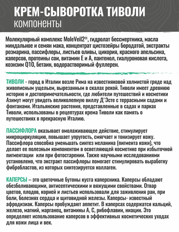 Итальянский городок Тиволи, известный мягким и теплым климатом, подарил название не менее легкой и нежной увлажняющей крем-сыворотке для ухода за кожей вокруг глаз и лица.Как и остальные представители молекулярной косметики, входящие в линейку Азимут, данное средство прекрасно подойдет жирной, пористой коже.При этом использовать его могут не только женщины, но и мужчины – унисекс направленность воплощается в характерном аромате с легкими восточными и пряными нотами.Сыворотка Тиволи обеспечивает легкое увлажнение, повышает тургор кожи, успокаивает ее.Насыщенный растительными компонентами – маслами и экстрактами трав – состав активно воздействует на кожу:Гидролат бессмертника, занимающий почетное второе место в списке компонентов, славится своим регенеративным свойством, благодаря чему Тиволи оценит сильный пол – сыворотка мгновенно успокоит раздражение после бритья, заживит порезы и обеспечит быстрое восстановление кожи.Не меньшую пользу Тиволи принесет и женщинам, успешно нивелируя проявления купероза и постакне.Масло семян мака также активно снимает раздражение и укрепляет защитную функцию эпидермиса.Наравне с миндальным, маковое масло является отличным помощником в борьбе с возрастными изменениями кожи – препятствует появлению морщин и обладает ярковыраженным лифтинг-эффектом.Концентрат водоросли цистозейры бородатой стимулирует активность клеток, оказывая омолаживающее воздействие, минеральные соли в ее составе восстанавливают водный баланс кожи, а аминокислоты – питают.Молекулярный комплекс обеспечивает мгновенный лифтинг. Инновационный антиоксидант фуллерен С60 нейтрализует свободные радикалы, предохраняет кожу от повреждений.