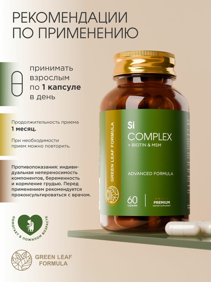 Кремний + Биотин + MSM от бренда GREEN LEAF FORMULA — это высококачественный витаминный комплекс, который поддерживает здоровье кожи, волос и суставов. В каждой упаковке содержится 60 капсул, обеспечивающих ваш организм необходимыми питательными веществами.