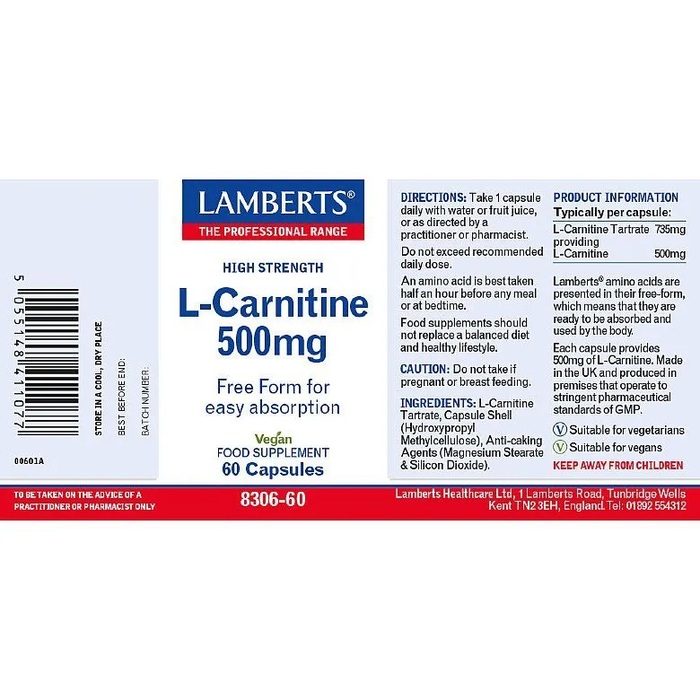 Л-карнитин Lamberts 500 мг — это высококачественная добавка, предназначенная для поддержки энергетического обмена и улучшения физической активности. В каждой упаковке содержится 60 капсул, что обеспечивает длительный курс приема.
